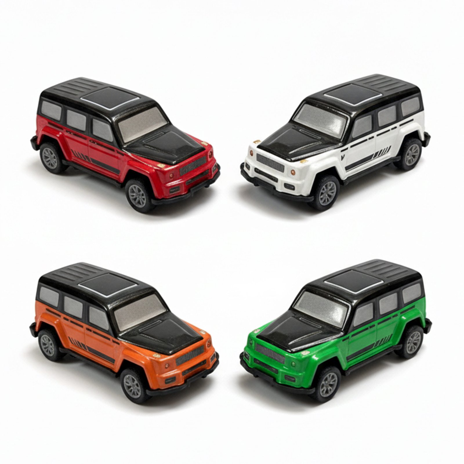 Vibrant Assorted Colours – Red, green, orange, and white mini SUVs kids will love.