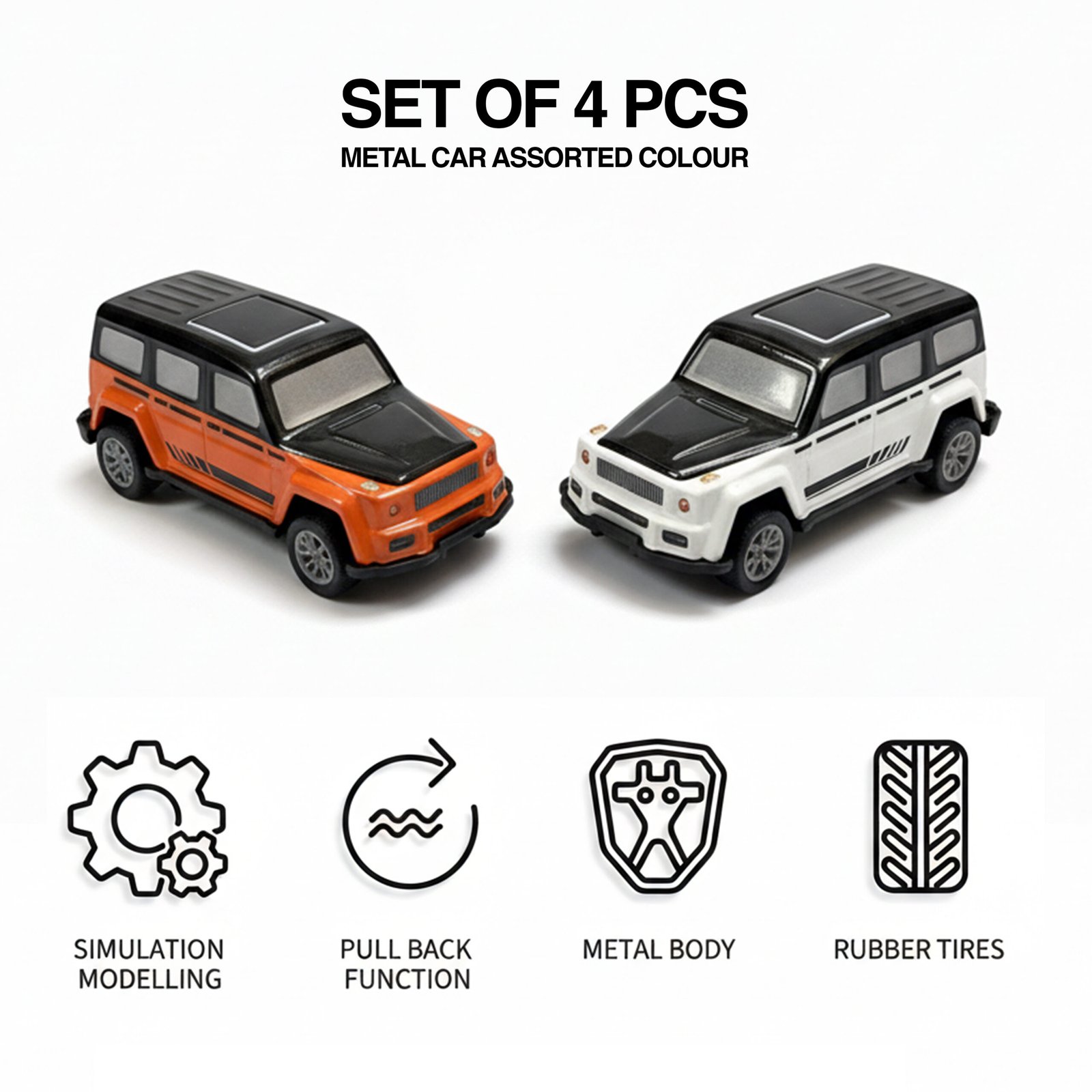 Fuel endless fun with this 1:64 Metal Pull Back Car Toy Set of 4, designed for kids who love speed, adventure, and collectible toy cars! Each mini SUV is built with a sturdy die-cast metal body, smooth rubber tires, and a fast pull-back mechanism—just pull backward and release to watch the car zoom ahead. No batteries needed!