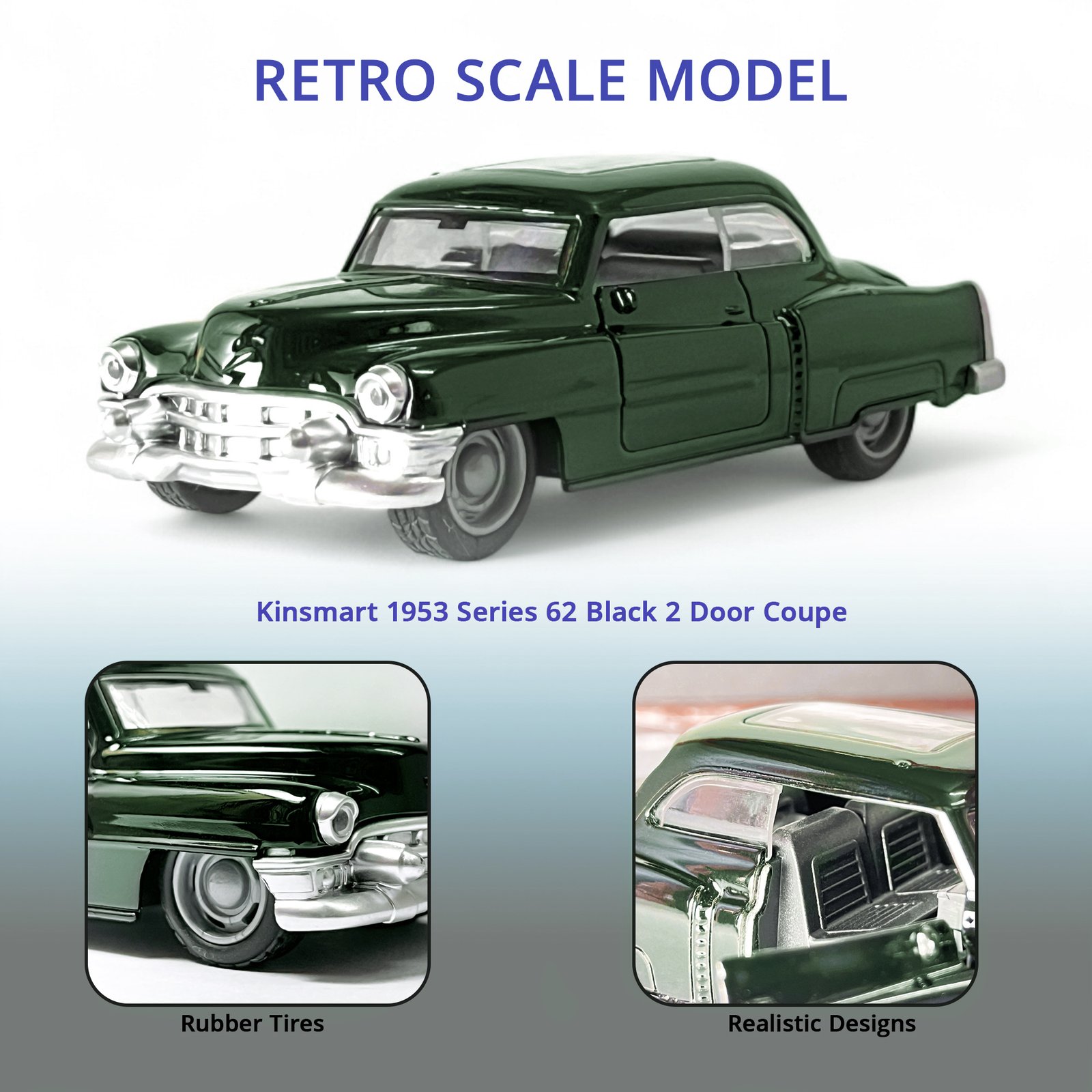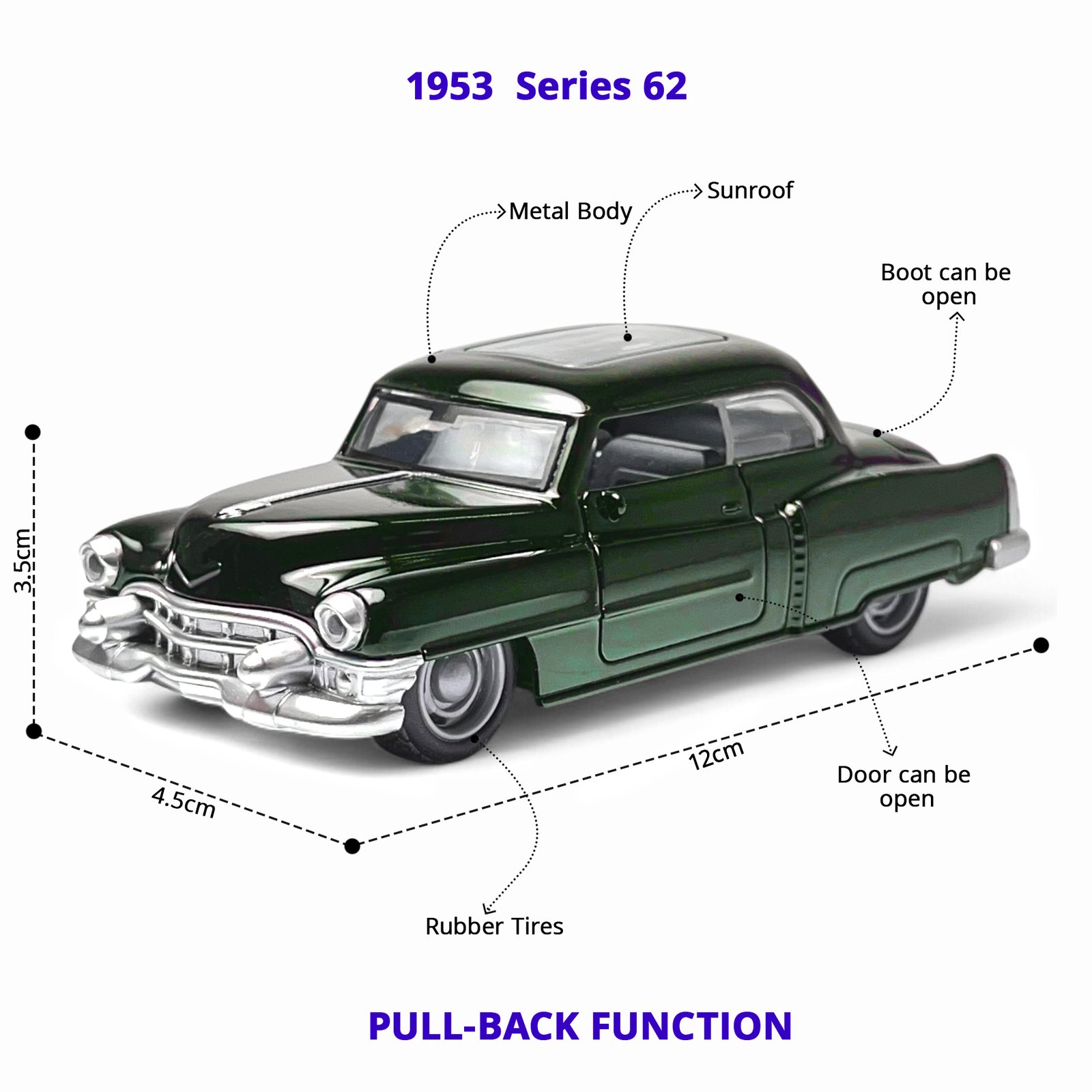 Bring timeless retro charm to your collection with the Vintage Classic Coupe, a beautifully crafted die-cast model inspired by iconic 1950s automobile styling. Finished in an elegant forest green shade, this miniature classic offers premium detailing, a sturdy metal body, and smooth rubber tires for realistic play.