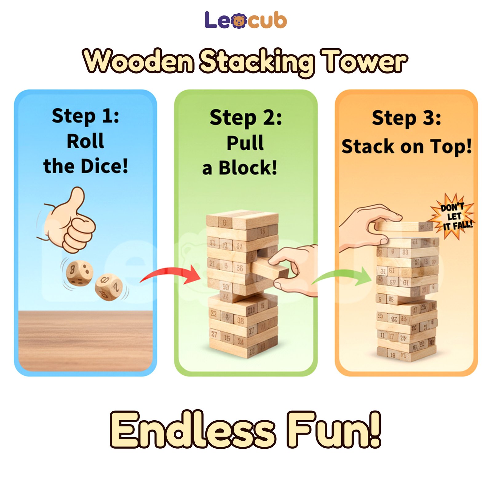 Discover the joy of balance, focus, and fun with the Leocub Wooden Stacking Tower Game — a timeless family favourite designed for both kids and adults!